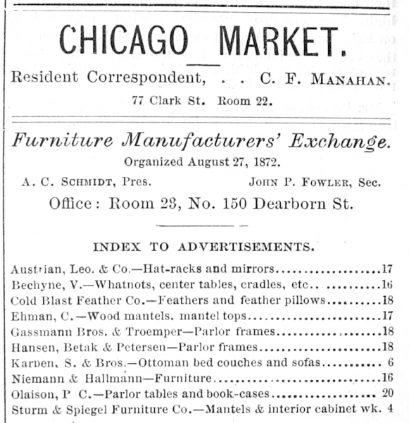 - “ ‘The American Cabinet Makers’ Guide Map of Chicago Furniture Manufacturers and Kindred Trades,” American Cabinet Maker and Upholsterer, Aug. 21, 1880, 16-17. ↑