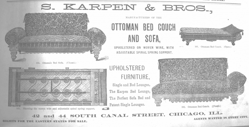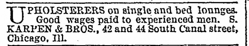A few months later, Karpen Bros. move to its new “warerooms” and upholstery factory at 42- 44 South Canal Street, between Madison and Washington, where they occupied four large floors.[34] The upholstery factory was located in the center of the furniture manufacturing area of the city,[35] “with about three times their former room.” Then about a 100 “hands” were “engaged in the production of parlor furniture, the Schrock Patent Ottoman Bed Couch, Karpen’s patent bed lounges and patent single lounges.” [36]