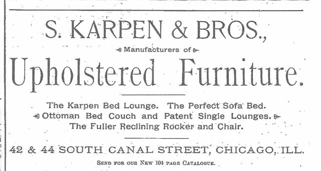 Solomon Karpen understood from the beginning that there would be strength in having his eight brothers associated with him for the one purpose, joined as they were, not only by ties of family, but by tradition, common interests and the same ideals of workmanship. He enlisted one after another in the business, until all were finally part and parcel of it. Each brother in his turn entered the business as an apprentice and learned it from the lumber yard to the shipping platform. — Chicago Furniture Manufacturers Association. “The Story of Karpen.” Chicago: Chicago Furniture Manufacturers Association, August 26, 1930.