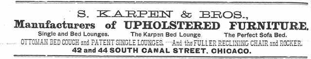 Again in 1887, S. Karpen & Bros. exhibited at the Industrial Exposition. It had “a display of three ottoman lounges and sofa-beds, which, while it shows the many desirable features of the article to advantage, it is far overshadowed by the display the firm makes in their own showroom.”[50] The trade paper reporter was very critical of the event, however, concluding that “until the furniture manufacturers of this city are united in better shape than there seems any present prospect of, they had better let the Chicago Exposition severely alone.”[51]