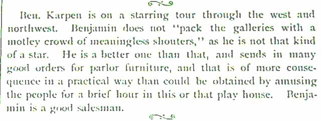 The company’s advertisements identified its marketing goals: “For Sale by all first class Furniture Houses in the U.S”[37] and “Agents wanted in every city.”[38] Its sales force grew to cover more regions of the country.[39] C.F. Blackman covered the Northwest, and W. F. Tenney traveled through the South. The Karpen salesmen covered the country bringing in substantial orders. Before 1890, Karpen handled their goods in the Pacific coast territory entirely through commission men, but “the success with which their salesmen met has decided them to cover the territory with their own men hereafter.”[40] It was Benjamin who often took extended trips to the Pacific Coast.[41][42][43] Mike still traveled in the West so that region was well covered. Sig (S. C.) Fish worked as its salesman in the East; he knew the business well because his family owned a retail furniture store in Chicago.[44]