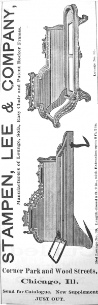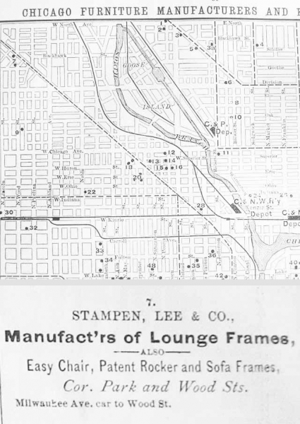 1887 was an important year in growth of Karpen Bros. In January it purchased the Chicago parlor furniture frame company of Stampen, Lee & Co.[16][17] The trade paper announced: “S. Karpen & Bros. have purchased the machinery, stock and furniture of the old factory of Stampen, Lee & Co., and will get into that market under the style of the Parlor & Lounge Frame Co.” [18]