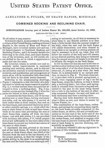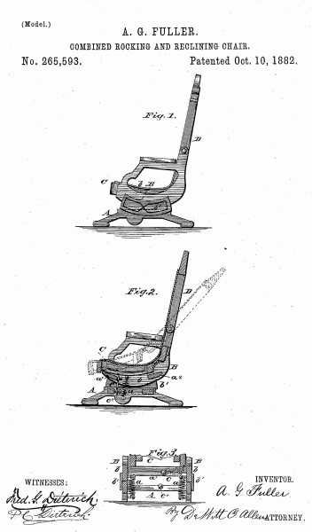 Karpen Bros. added to its patented furniture line by obtaining the Fuller patent for a new reclining rocker from Alexander G. Fuller. “In general appearance it is like any other patent rocker, but it is so arranged that a person seated in it can without rising place it any desired angle and fasten it there and it can be entirely open or closed without getting out of it.”[54]