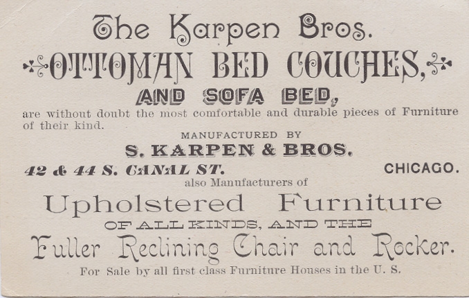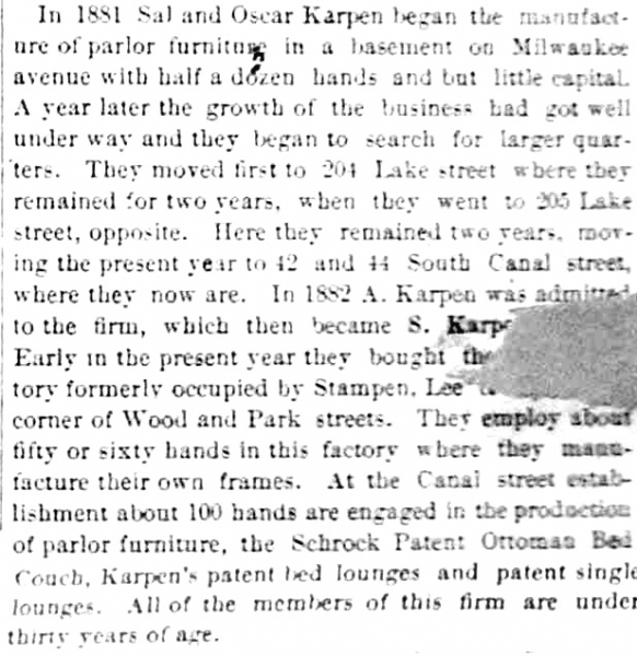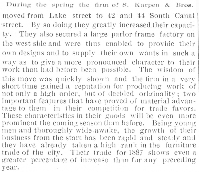 An 1887 “Historical Sketch of the Furniture Trade of Chicago” included the Karpen Bros. story:
