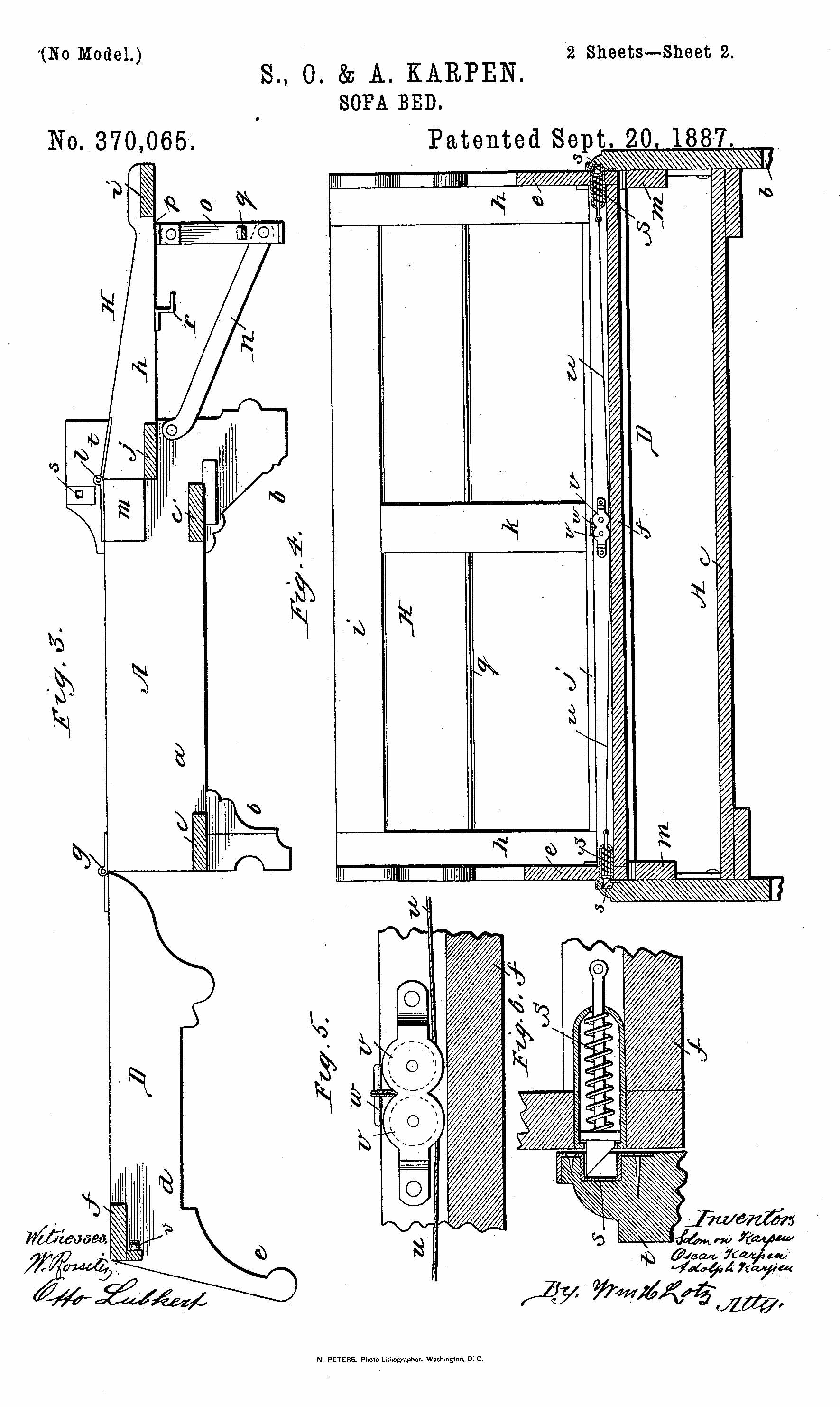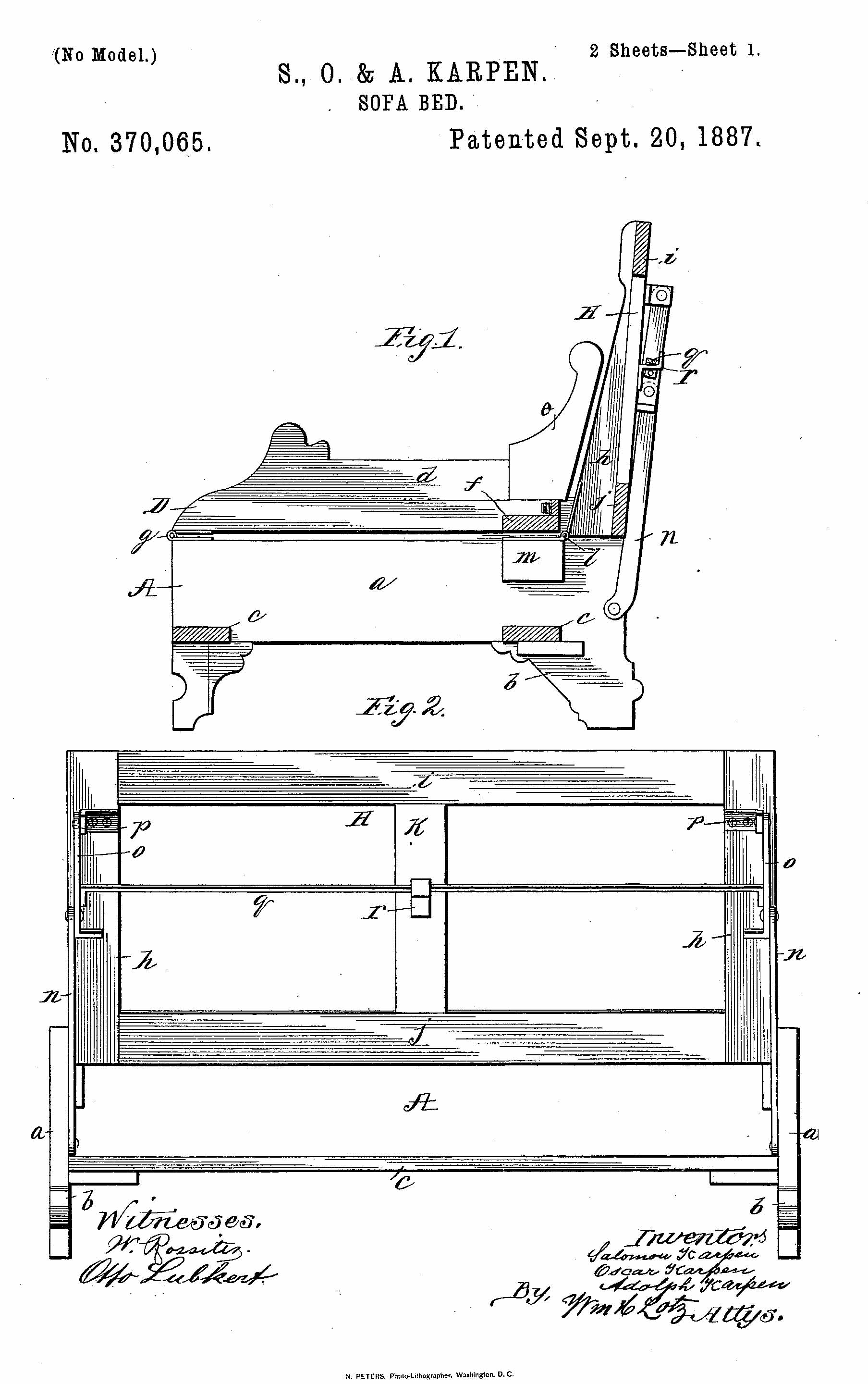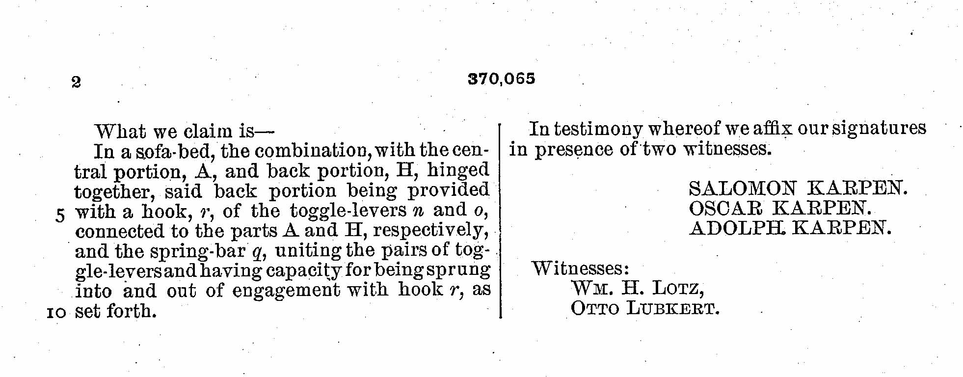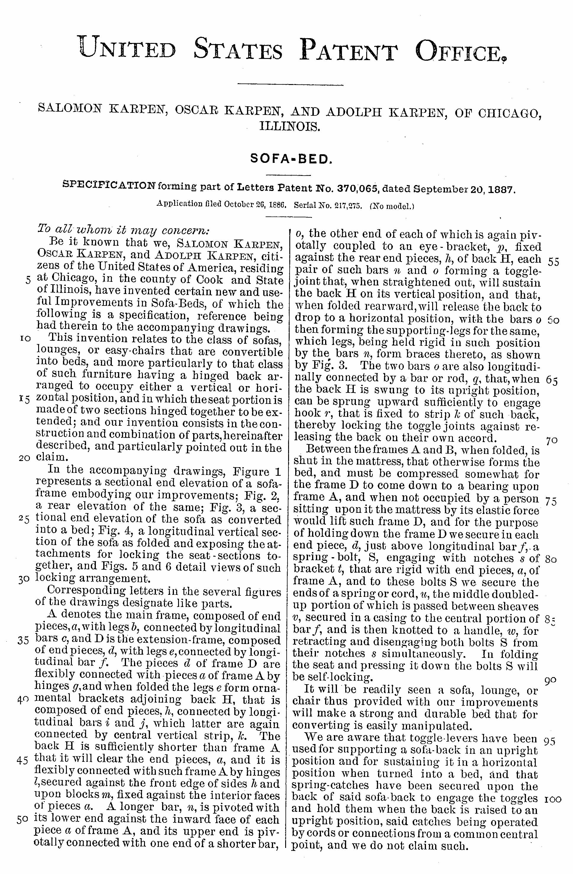 In 1887, Salomon [sic], Oscar, and Adolph were issued their first patent. They patented a sofa-bed under U.S. Patent # 370,065, September 20, 1887. It was listed under “Index of Inventions” in the October 8, 1887 issue of Scientific American.[52]