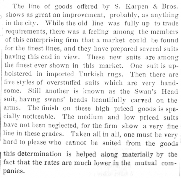 The reputation of Karpen Bros. continued to grow. The trade papers wrote in glowing phrases about “that enterprising firm of parlor furniture manufacturers.” [56]