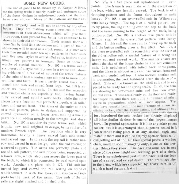 Karpen Bros. produced many styles of suites in their frame factory. Many of the patterns were its exclusive property and were not shown by any other “house” or company.[59] The reporters described in detail the variety of frame styles and upholstery fabrics in production
