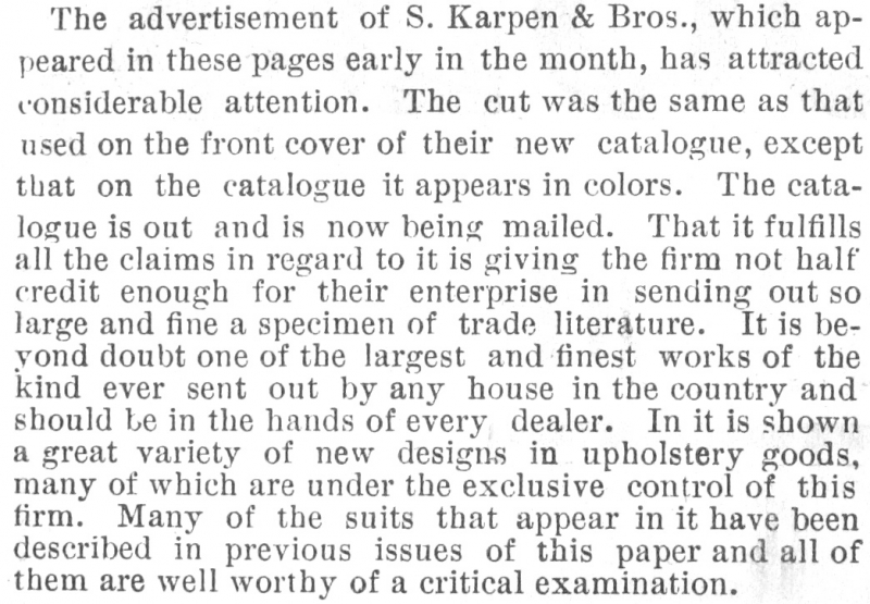 The firm announced large sales from its new catalog, and it was well pleased with the expenditure. It “proved to them that something artistic and faithful in its story is money well spent.”[75] “S. Karpen & Bros. are very busy—more so than a year ago. Their new catalogue is in great demand and is already bringing in substantial results.” [76]